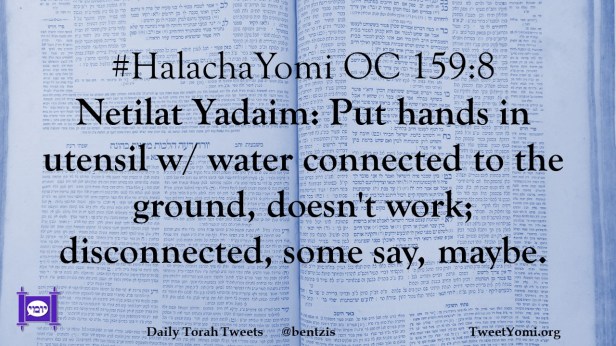 #HalachaYomi OC 159:8 Netilat Yadaim: Put hands in utensil w/ water connected to the ground, doesn’t work; disconnected, some say, maybe.