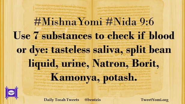 #MishnaYomi #Nida 9:6 Use 7 substances to check if blood or dye: tasteless saliva, split bean liquid, urine, Natron, Borit, Kamonya, potash.