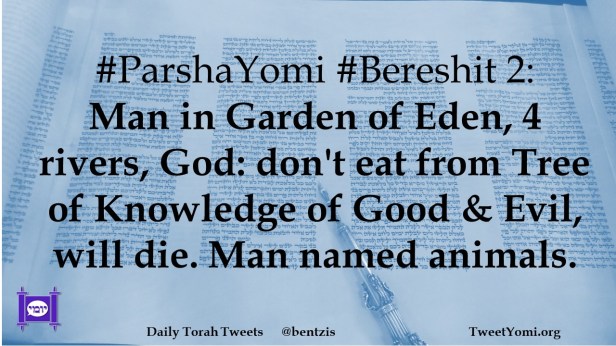 #ParshaYomi #Bereshit 2: Man in Garden of Eden, 4 rivers, God: don’t eat from Tree of Knowledge of Good & Evil, will die. Man named animals.