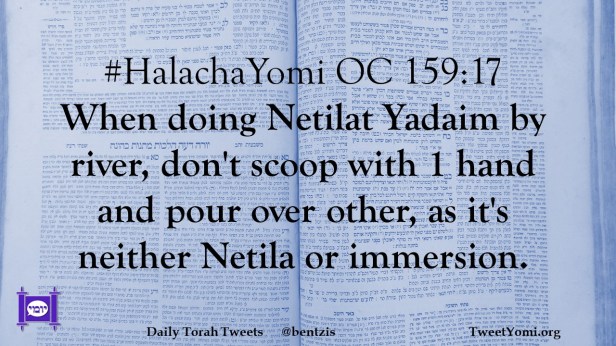 #HalachaYomi OC 159:17 When doing Netilat Yadaim by river, don’t scoop with 1 hand and pour over other, as it’s neither Netila or immersion.