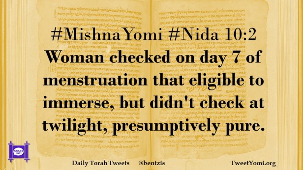#MishnaYomi #Nida 10:2 Woman checked on day 7 of menstruation that eligible to immerse, but didn’t check at twilight, presumptively pure.
