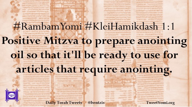#RambamYomi #KleiHamikdash 1:1 Positive Mitzva to prepare anointing oil so that it’ll be ready to use for articles that require anointing.