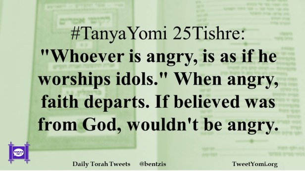 #TanyaYomi 25Tishre: “Whoever is angry, is as if he worships idols.” When angry, faith departs. If believed was from God, wouldn’t be angry.