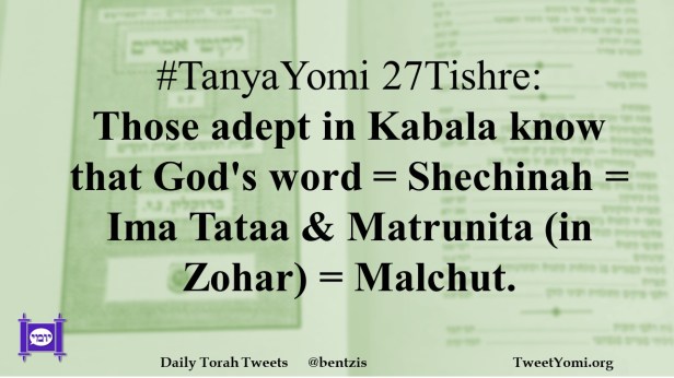 TanyaYomi #TanyaYomi 27Tishre Date: October 3, 2021Author: ysspitz #TanyaYomi 27Tishre: Those adept in Kabala know that God’s word = Shechinah = Ima Tataa & Matrunita (in Zohar) = Malchut. Share this: Share on X (Opens in new window) X Share on Facebook (Opens in new window) Facebook Like Loading... Related