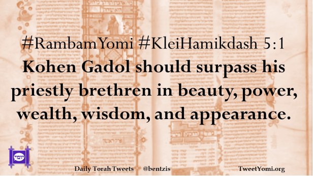 #RambamYomi #KleiHamikdash 5:1 Kohen Gadol should surpass his priestly brethren in beauty, power, wealth, wisdom, and appearance.
