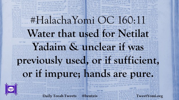 #HalachaYomi OC 160:11 Water that used for Netilat Yadaim & unclear if was previously used, or if sufficient, or if impure; hands are pure.