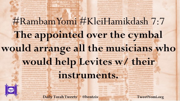 #RambamYomi #KleiHamikdash 7:7 The appointed over the cymbal would arrange all the musicians who would help Levites w/ their instruments.