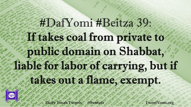 Beitza, DafYomi #DafYomi #Beitza 39 Date: October 8, 2021Author: ysspitz #DafYomi #Beitza 39: If takes coal from private to public domain on Shabbat, liable for labor of carrying, but if takes out a flame, exempt. Share this: Share on X (Opens in new window) X Share on Facebook (Opens in new window) Facebook Like Loading... Related