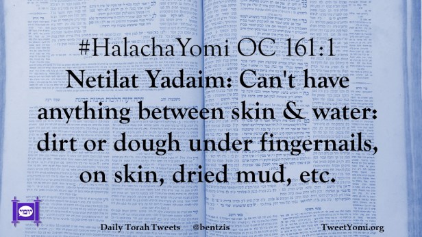 #HalachaYomi OC 161:1 Netilat Yadaim: Can’t have anything between skin & water: dirt or dough under fingernails, on skin, dried mud, etc.