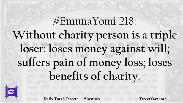 #EmunaYomi 218: Without charity person is a triple loser: loses money against will; suffers pain of money loss; loses benefits of charity.