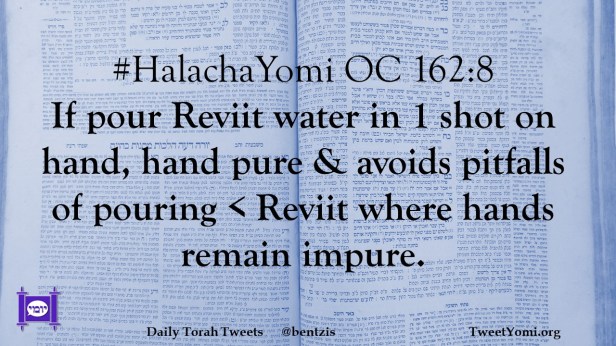 #HalachaYomi OC 162:8 If pour Reviit water in 1 shot on hand, hand pure & avoids pitfalls of pouring < Reviit where hands remain impure.