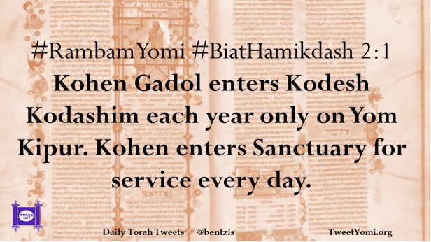 #RambamYomi #BiatHamikdash 2:1 Kohen Gadol enters Kodesh Kodashim each year only on Yom Kipur. Kohen enters Sanctuary for service every day.