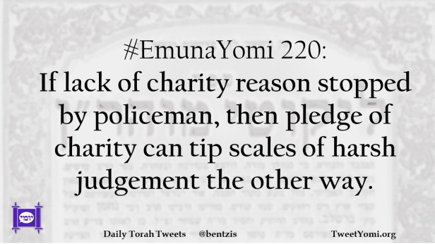 #EmunaYomi 220: If lack of charity reason stopped by policeman, then pledge of charity can tip scales of harsh judgement the other way.