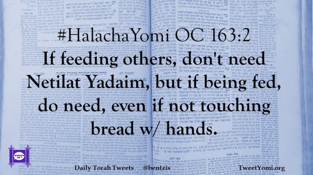 #HalachaYomi OC 163:2 If feeding others, don’t need Netilat Yadaim, but if being fed, do need, even if not touching bread w/ hands.
