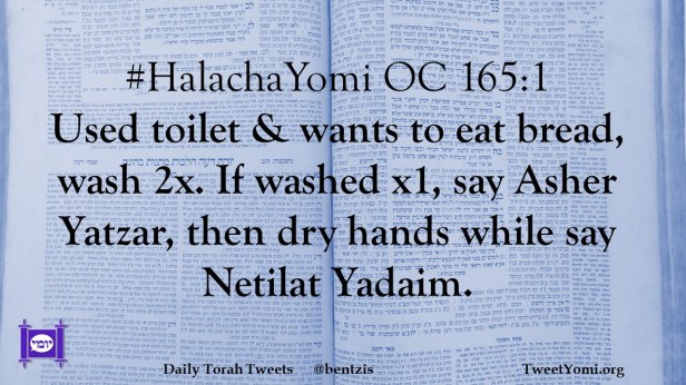 #HalachaYomi OC 165:1 Used toilet & wants to eat bread, wash 2x. If washed x1, say Asher Yatzar, then dry hands while say Netilat Yadaim.