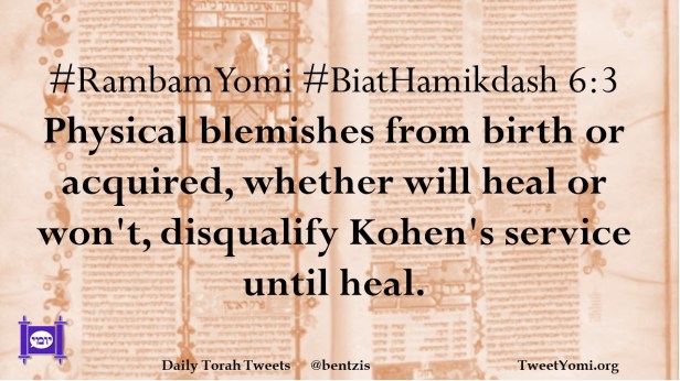 #RambamYomi #BiatHamikdash 6:3 Physical blemishes from birth or acquired, whether will heal or won’t, disqualify Kohen’s service until heal.