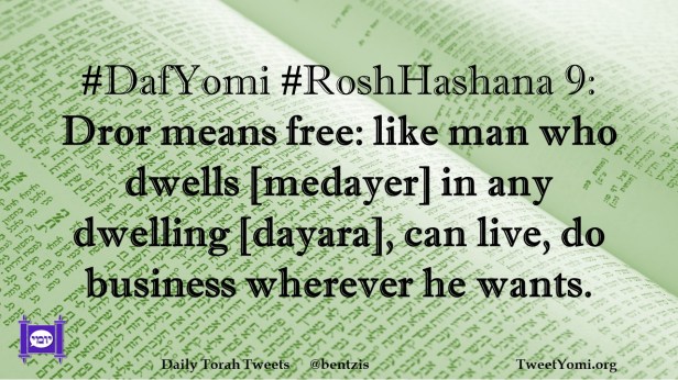 #DafYomi #RoshHashana 9: Dror means free: like man who dwells [medayer] in any dwelling [dayara], can live, do business wherever he wants.