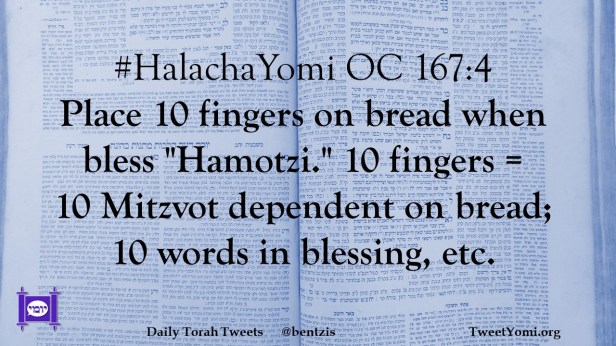 #HalachaYomi OC 167:4 Place 10 fingers on bread when bless “Hamotzi.” 10 fingers = 10 Mitzvot dependent on bread; 10 words in blessing, etc.
