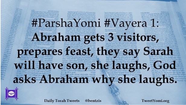 #ParshaYomi #Vayera 1: Abraham gets 3 visitors, prepares feast, they say Sarah will have son, she laughs, God asks Abraham why she laughs.