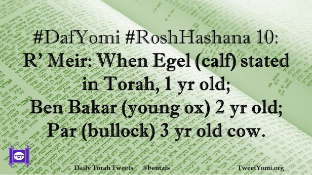 #DafYomi #RoshHashana 10: R’ Meir: When Egel (calf) stated in Torah, 1 yr old; Ben Bakar (young ox) 2 yr old; Par (bullock) 3 yr old cow.