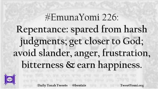 #EmunaYomi 226: Repentance: spared from harsh judgments; get closer to God; avoid slander, anger, frustration, bitterness & earn happiness.