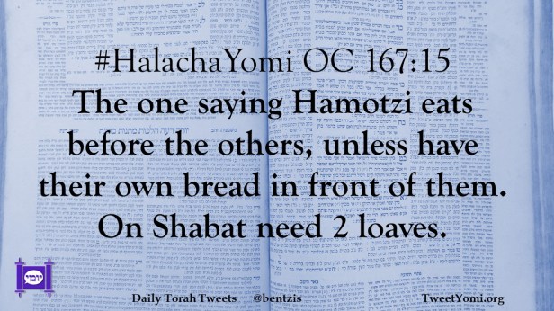 #HalachaYomi OC 167:15 The one saying Hamotzi eats before the others, unless have their own bread in front of them. On Shabat need 2 loaves.