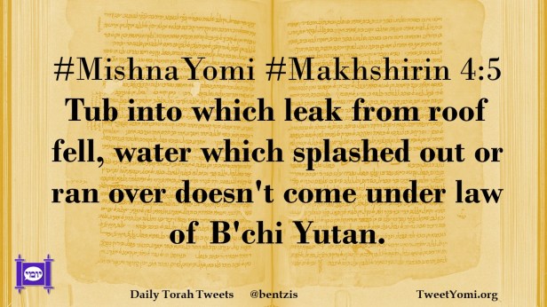 #MishnaYomi #Makhshirin 4:5 Tub into which leak from roof fell, water which splashed out or ran over doesn’t come under law of B’chi Yutan.