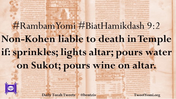 #RambamYomi #BiatHamikdash 9:2 Non-Kohen liable to death in Temple if: sprinkles; lights altar; pours water on Sukot; pours wine on altar.