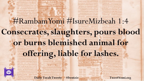 #RambamYomi #IsureMizbeah 1:4 Consecrates, slaughters, pours blood or burns blemished animal for offering, liable for lashes.