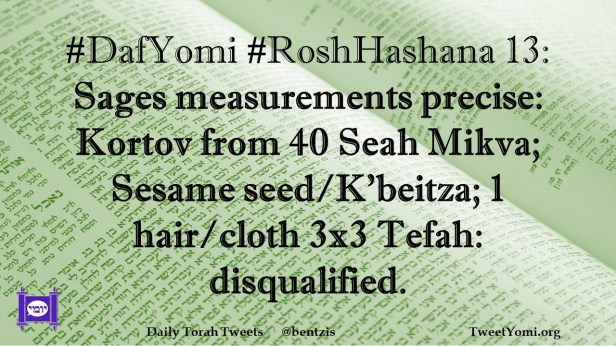 #DafYomi #RoshHashana 13: Sages measurements precise: Kortov from 40 Seah Mikva; Sesame seed/K’beitza; 1 hair/cloth 3×3 Tefah: disqualified.