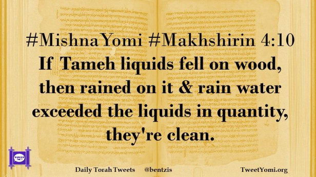 #MishnaYomi #Makhshirin 4:10 If Tameh liquids fell on wood, then rained on it & rain water exceeded the liquids in quantity, they’re clean.