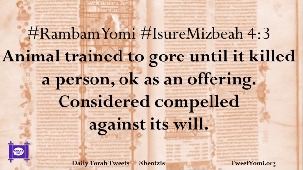 #RambamYomi #IsureMizbeah 4:3 Animal trained to gore until it killed a person, ok as an offering. Considered compelled against its will.