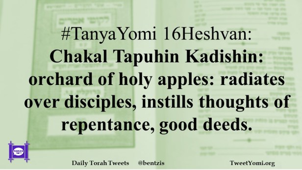 #TanyaYomi 16Heshvan: Chakal Tapuhin Kadishin: orchard of holy apples: radiates over disciples, instills thoughts of repentance, good deeds.