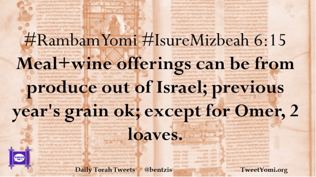 #RambamYomi #IsureMizbeah 6:15 Meal+wine offerings can be from produce out of Israel; previous year’s grain ok; except for Omer, 2 loaves.