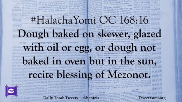 #HalachaYomi OC 168:16 Dough baked on skewer, glazed with oil or egg, or dough not baked in oven but in the sun, recite blessing of Mezonot.