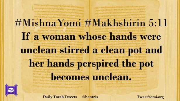#MishnaYomi #Makhshirin 5:11 If a woman whose hands were unclean stirred a clean pot and her hands perspired the pot becomes unclean.