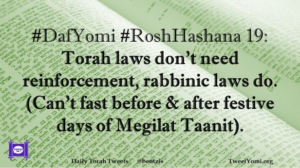 #DafYomi #RoshHashana 19: Torah laws don’t need reinforcement, rabbinic laws do. (Can’t fast before & after festive days of Megilat Taanit).