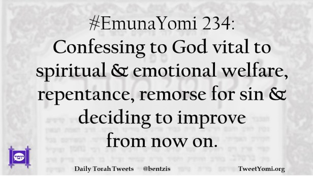 #EmunaYomi 234: Confessing to God vital to spiritual & emotional welfare, repentance, remorse for sin & deciding to improve from now on.