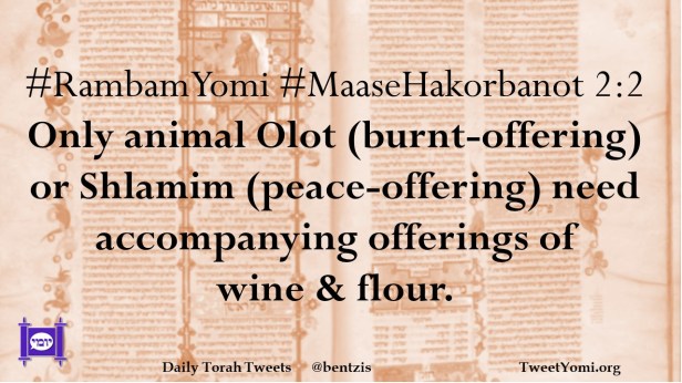 #RambamYomi #MaaseHakorbanot 2:2 Only animal Olot (burnt-offering) or Shlamim (peace-offering) need accompanying offerings of wine & flour.