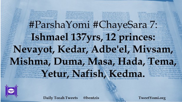 #ParshaYomi #ChayeSara 7: Ishmael 137yrs, 12 princes: Nevayot, Kedar, Adbe’el, Mivsam, Mishma, Duma, Masa, Hada, Tema, Yetur, Nafish, Kedma.