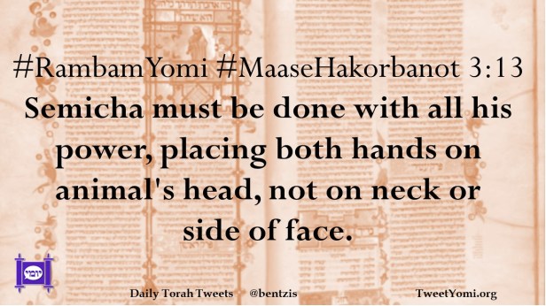 #RambamYomi #MaaseHakorbanot 3:13 Semicha must be done with all his power, placing both hands on animal’s head, not on neck or side of face.