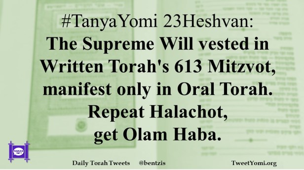 #TanyaYomi 23Heshvan: The Supreme Will vested in Written Torah’s 613 Mitzvot, manifest only in Oral Torah. Repeat Halachot, get Olam Haba.