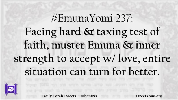 #EmunaYomi 237: Facing hard & taxing test of faith, muster Emuna & inner strength to accept w/ love, entire situation can turn for better.