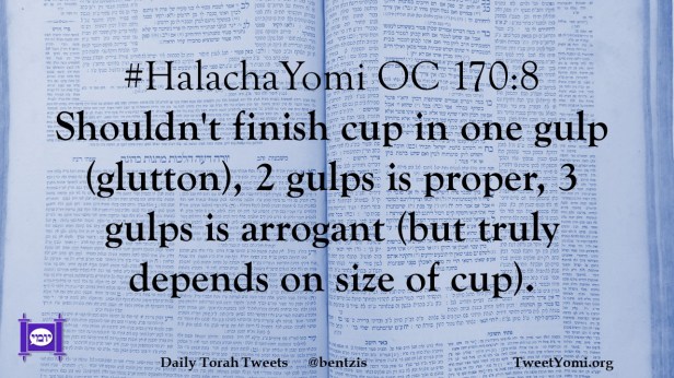 #HalachaYomi OC 170:8 Shouldn’t finish cup in one gulp (glutton), 2 gulps is proper, 3 gulps is arrogant (but truly depends on size of cup).
