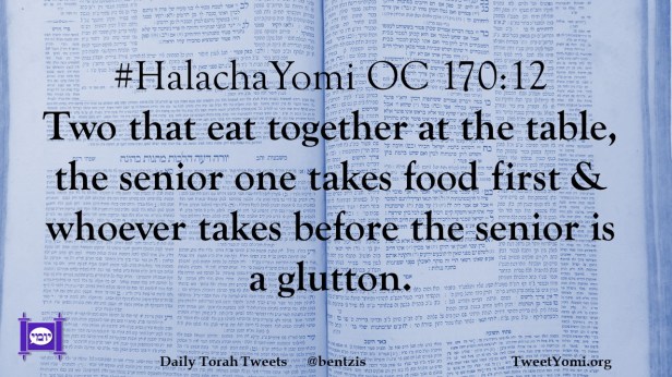 #HalachaYomi OC 170:12 Two that eat together at the table, the senior one takes food first & whoever takes before the senior is a glutton.