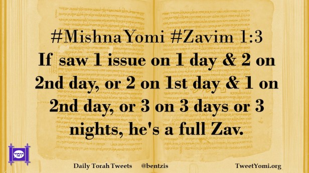 #MishnaYomi #Zavim 1:3 If saw 1 issue on 1 day & 2 on 2nd day, or 2 on 1st day & 1 on 2nd day, or 3 on 3 days or 3 nights, he’s a full Zav.