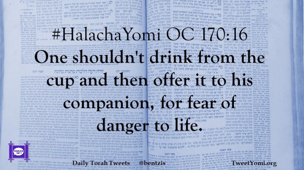 HalachaYomi #HalachaYomi OC 170:16 Date: November 4, 2021Author: ysspitz #HalachaYomi OC 170:16 One shouldn’t drink from the cup and then offer it to his companion, for fear of danger to life. Share this: Share on X (Opens in new window) X Share on Facebook (Opens in new window) Facebook Like Loading... Related