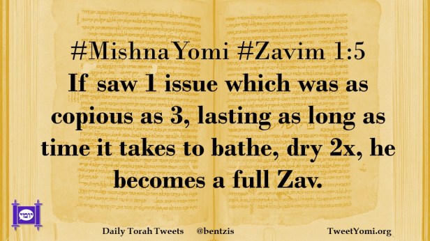 #MishnaYomi #Zavim 1:5 If saw 1 issue which was as copious as 3, lasting as long as time it takes to bathe, dry 2x, he becomes a full Zav.
