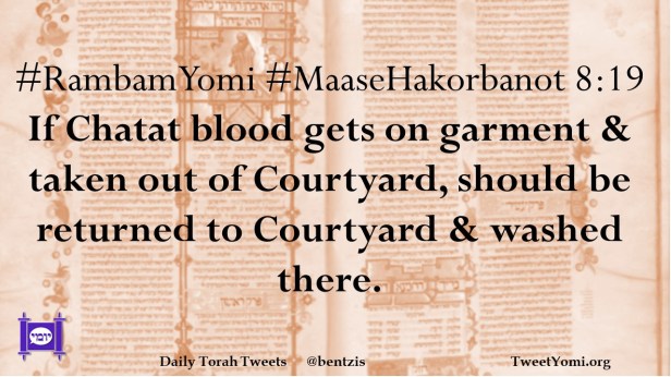#RambamYomi #MaaseHakorbanot 8:19 If Chatat blood gets on garment & taken out of Courtyard, should be returned to Courtyard & washed there.