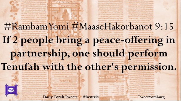 #RambamYomi #MaaseHakorbanot 9:15 If 2 people bring a peace-offering in partnership, one should perform Tenufah with the other’s permission.